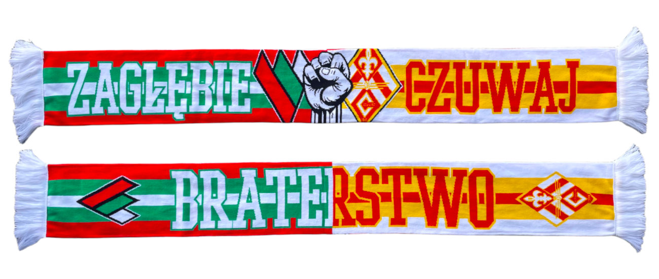 Szalik zgodowy “Zagłębie & Czuwaj” z białymi frędzlami. Dziany HDC.